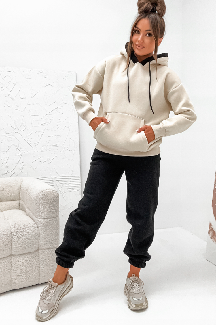 - Spodnie mają wygodny krój, wysoką gumkę w pasie i boczne kieszenie.