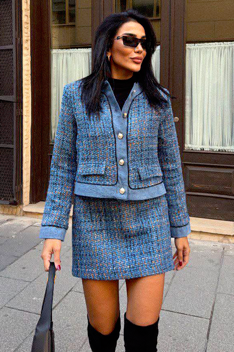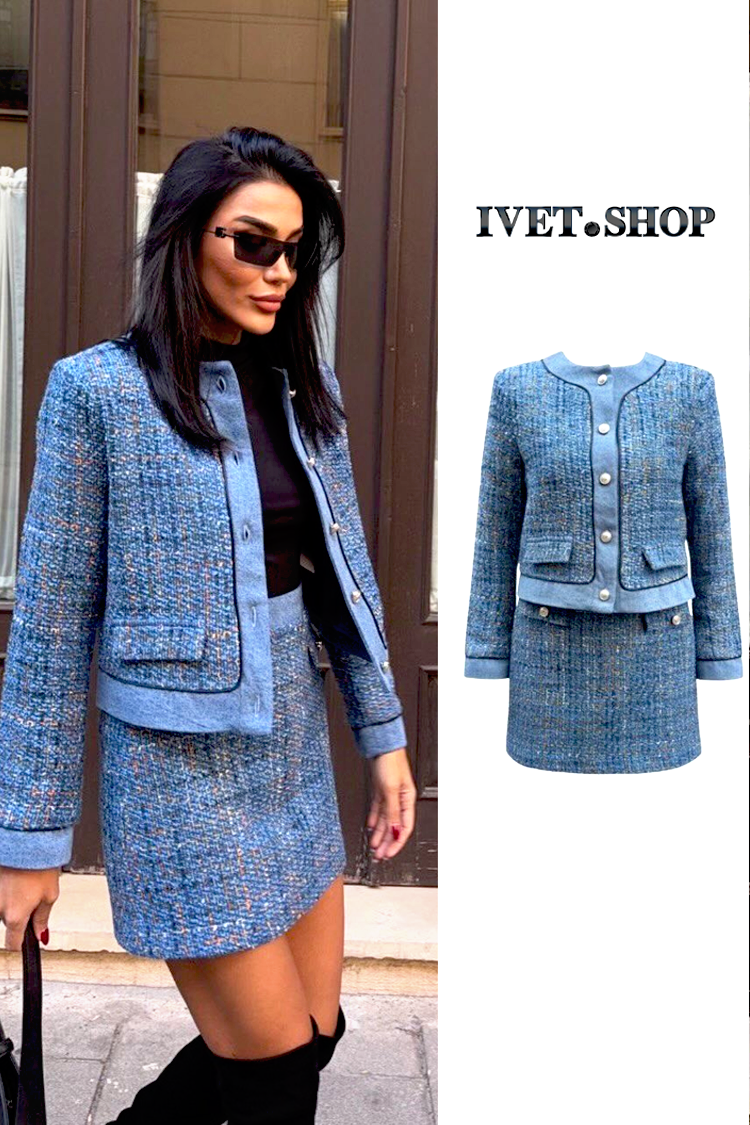 - Stylowy dwuczęściowy komplet w modny wzór: spódnica i żakiet, idealny do różnych stylizacji.