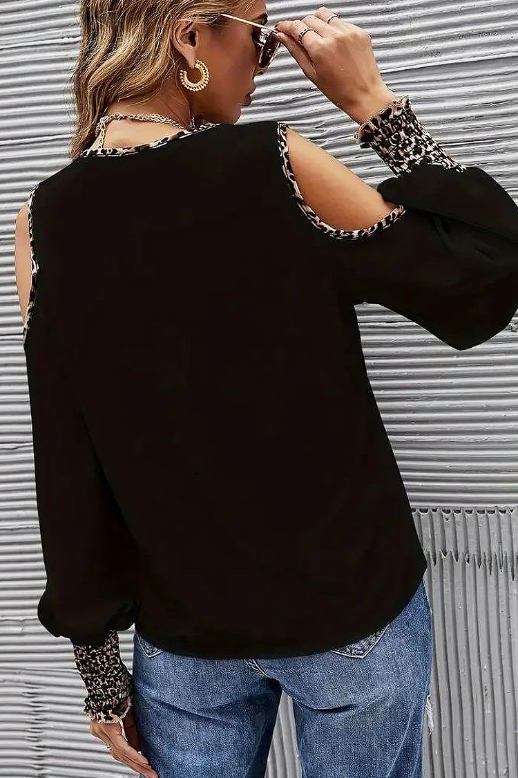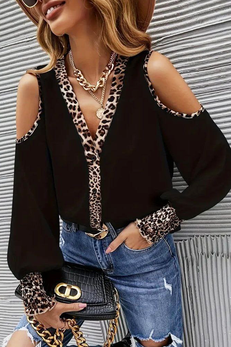 - Idealnie dopasowuje się do sylwetki. Model ma długie rękawy i efektowny wzór w panterkę z odkrytymi ramionami.