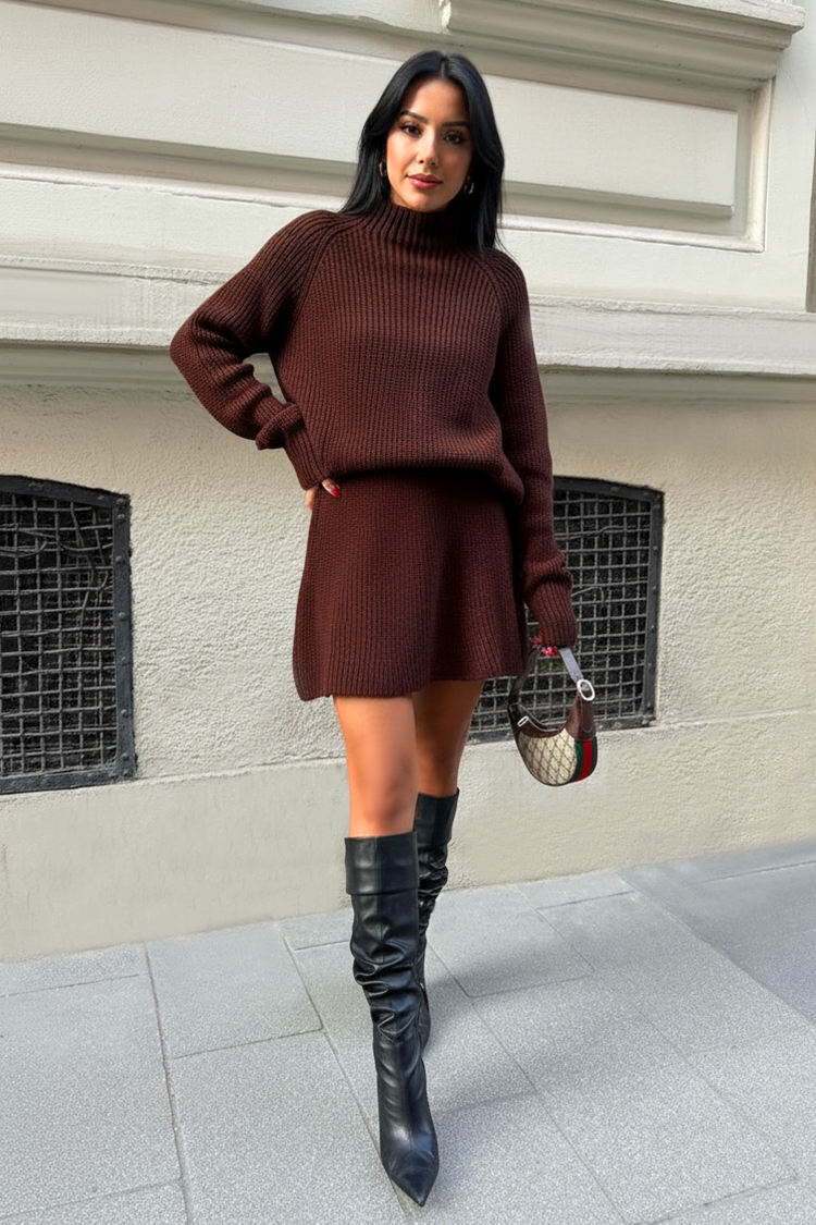 - Spódnica ma krótki krój i wysoki stan, a sweter ma wygodny, oversize'owy krój.