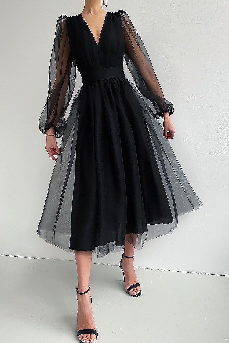 - Sukienka ma otwarty krój, dekolt, długie rękawy i efektowny tiul.