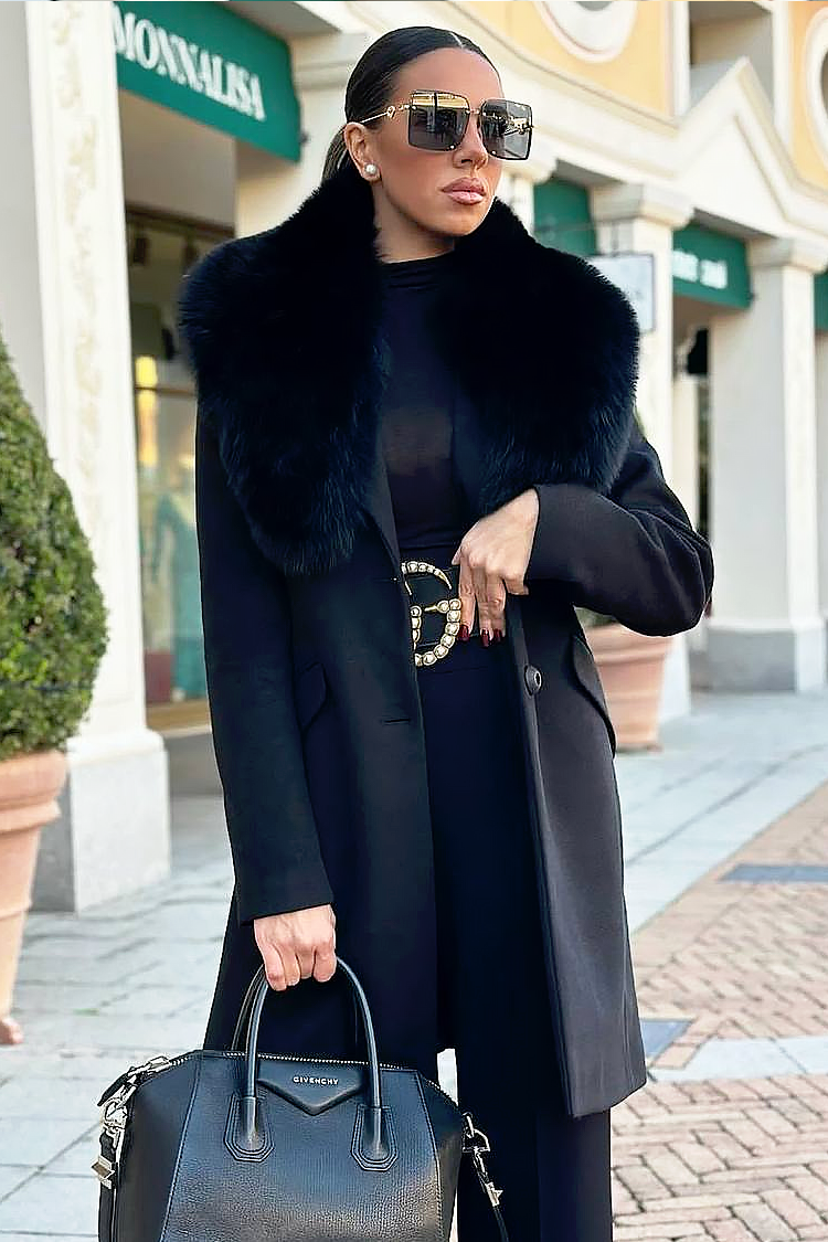 - Model ma wygodny krój, guziki, eleganckie kieszenie i obszerny, efektowny puchowy kołnierz.