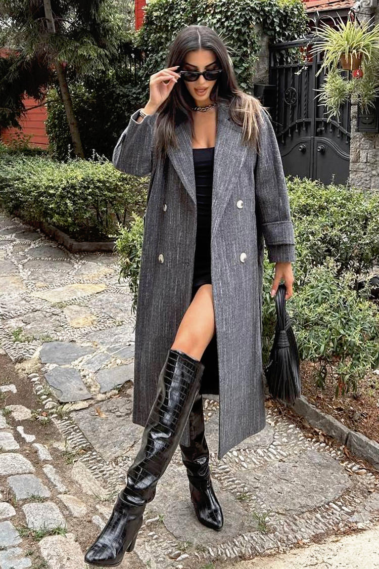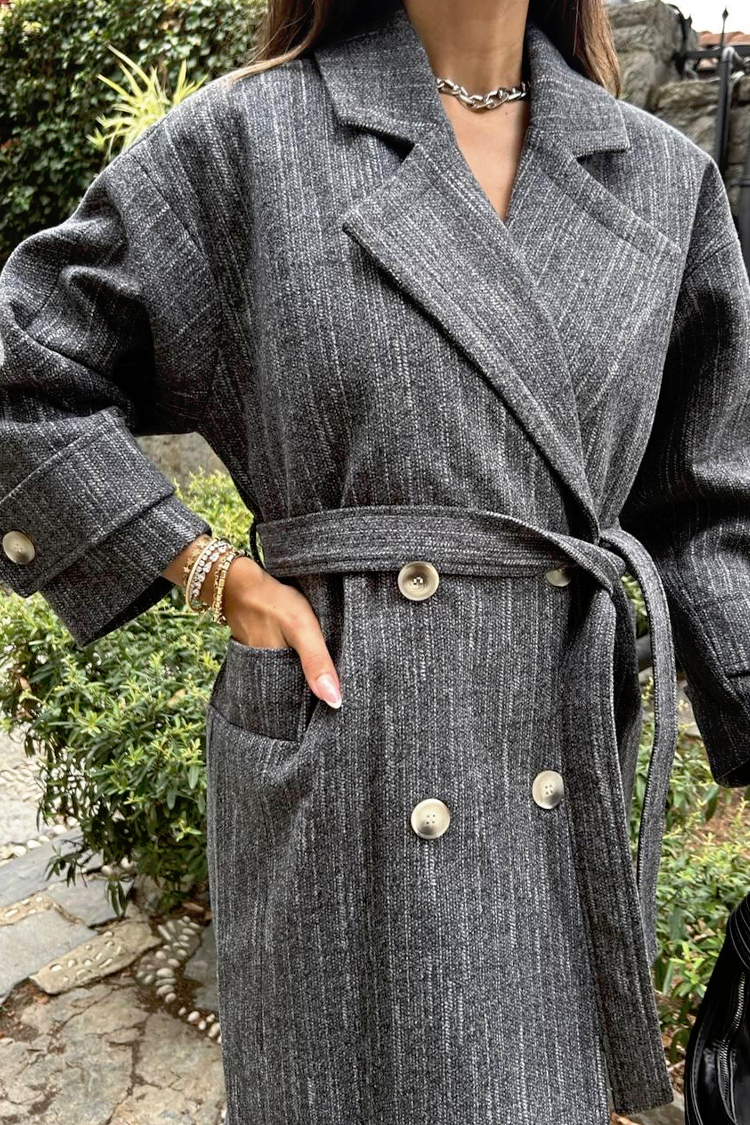 - Model ma klasyczny krój, efektowne mankiety, pasek z tego samego materiału i dwurzędowe zapięcie na guziki.