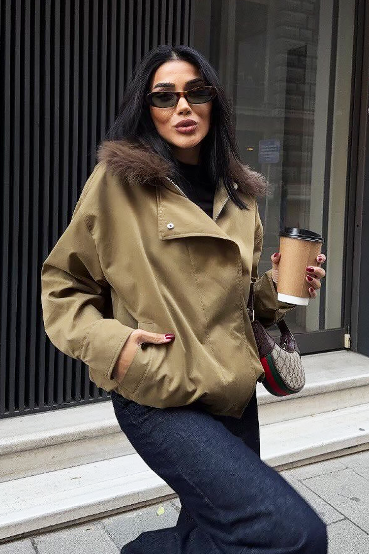 - Model posiada bufiasty kołnierz, boczne kieszenie oraz zapięcie na zamek błyskawiczny i guzik z przodu.