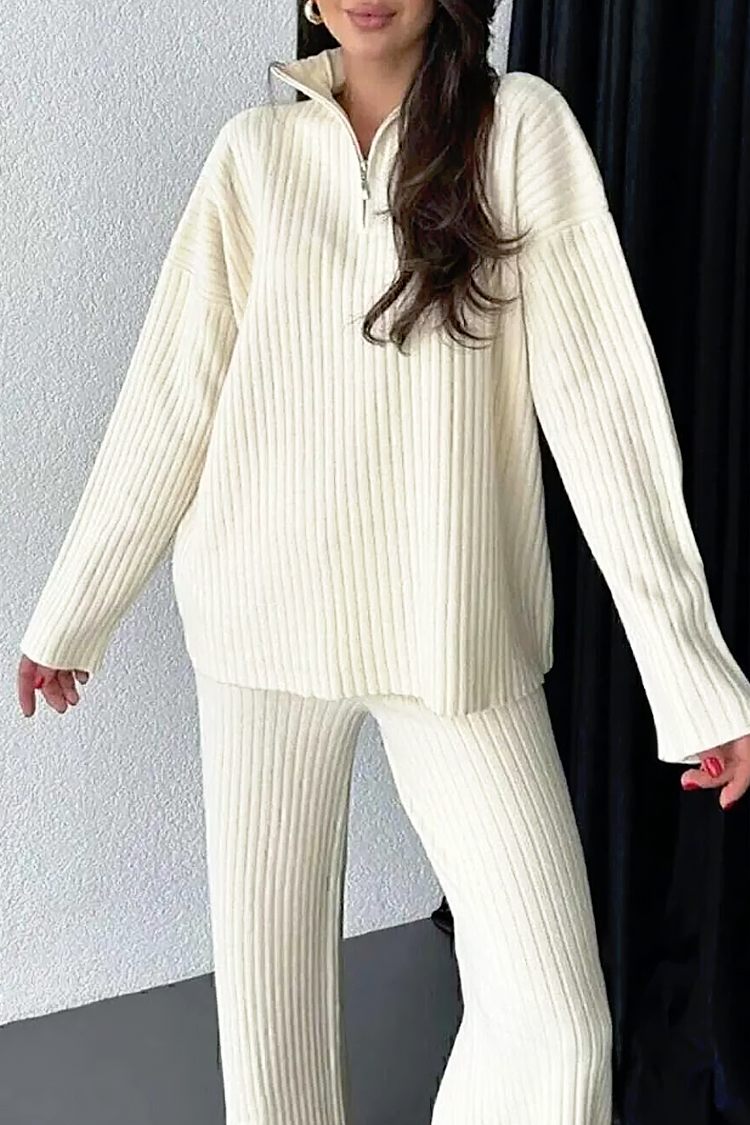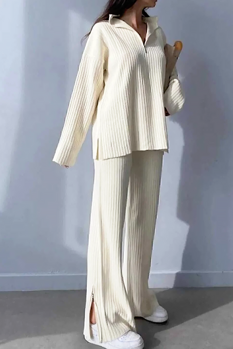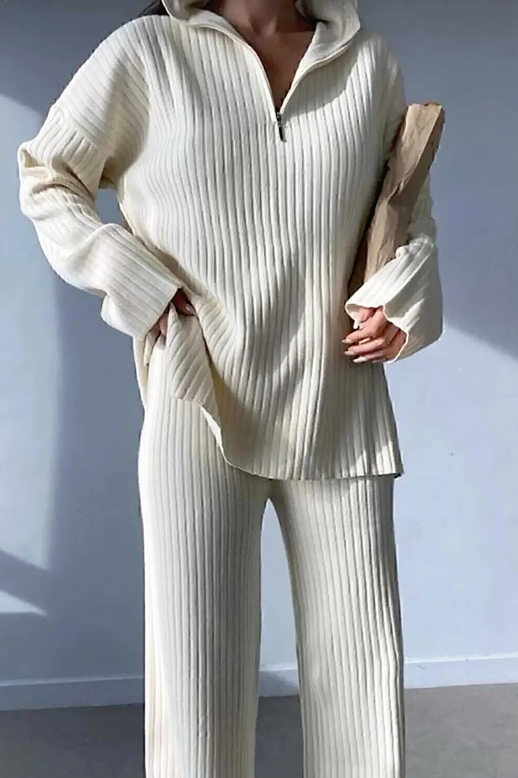 - Bluzka ma wygodny, oversize'owy krój, zapinana na zamek i kołnierzyk, a spodnie mają wysoki stan i szerokie nogawki.