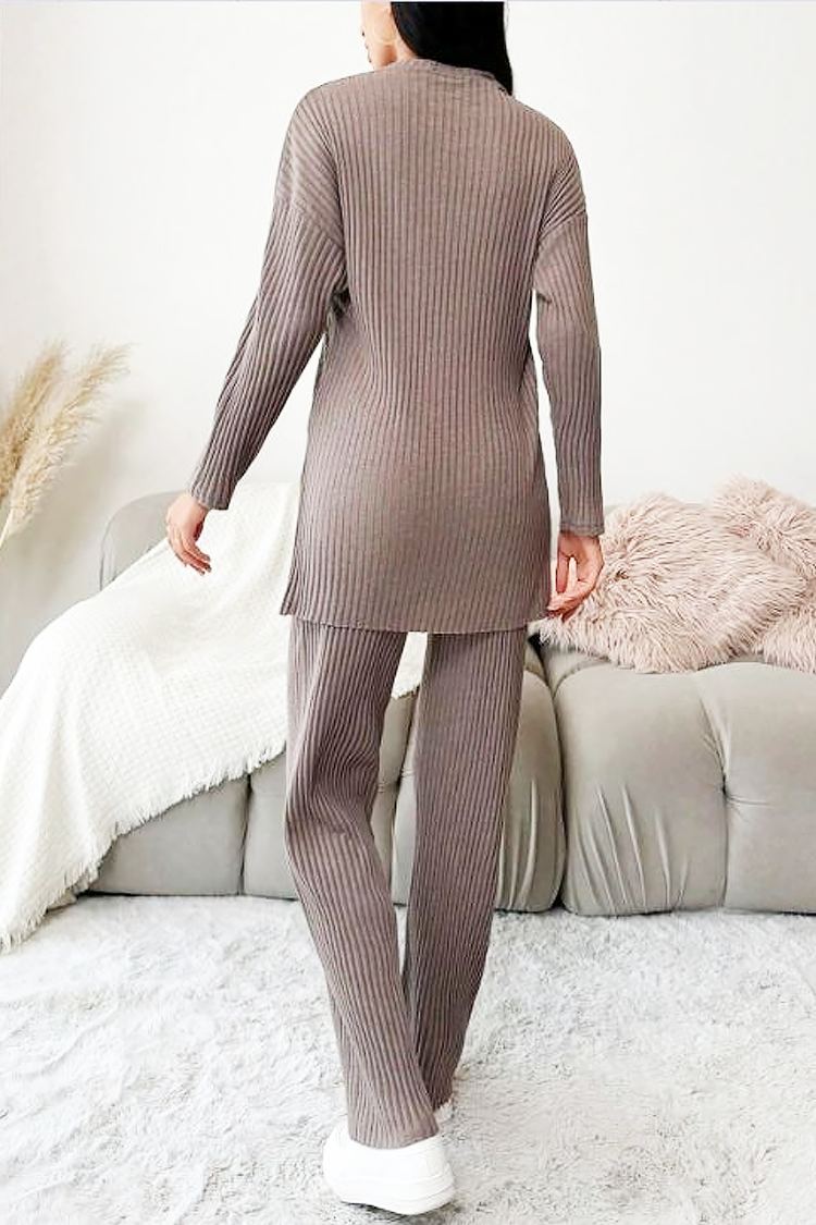 - Bluzka ma wygodny krój i długą długość, a spodnie mają wysoki stan i szerokie nogawki.
