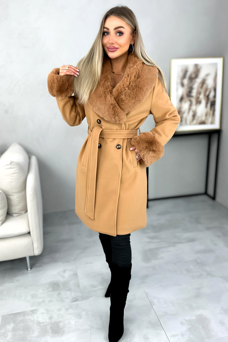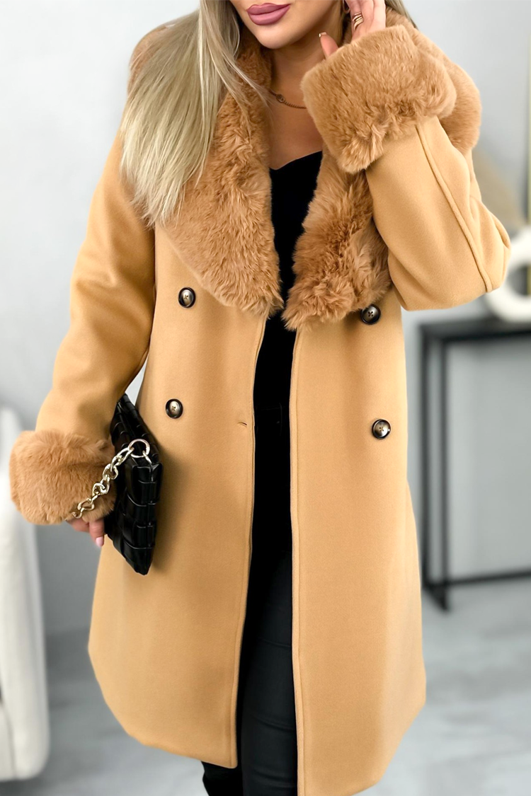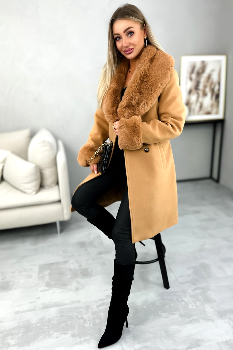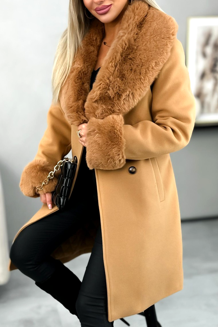 - Końce rękawów i kołnierzyk wykończone są miękkim puchem, co nadaje płaszczowi jeszcze bardziej spektakularny wygląd.