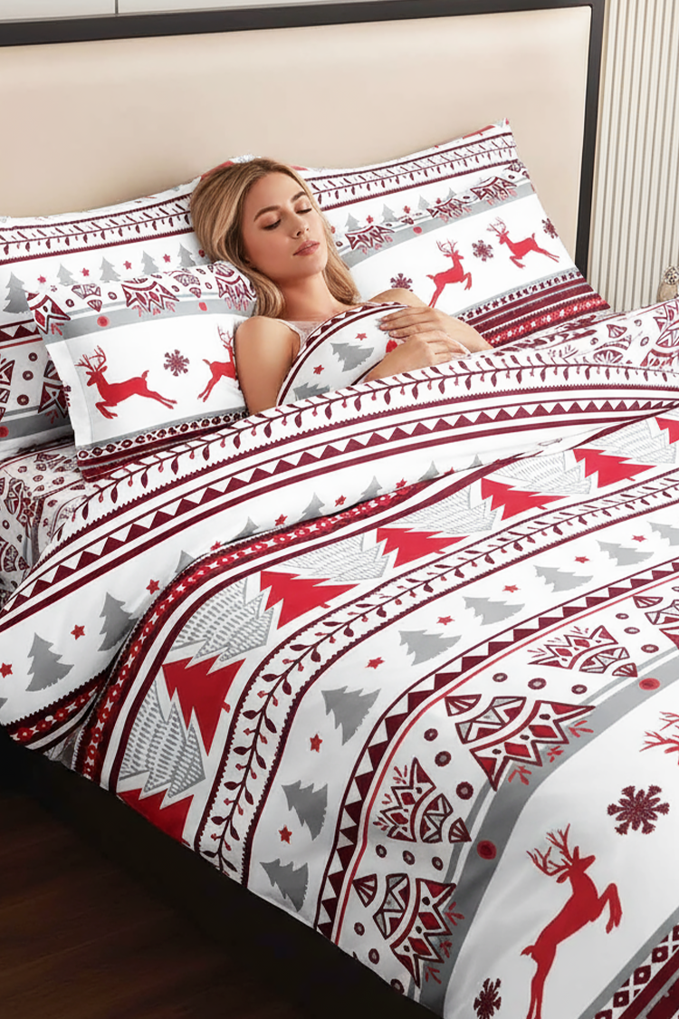 - Czteroczęściowy komplet pościeli świątecznej o wymiarach 160x200 cm, wykonany z wysokiej jakości satyny bawełnianej.