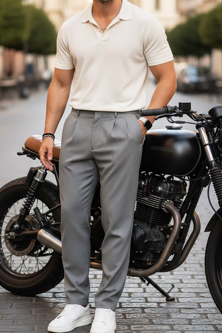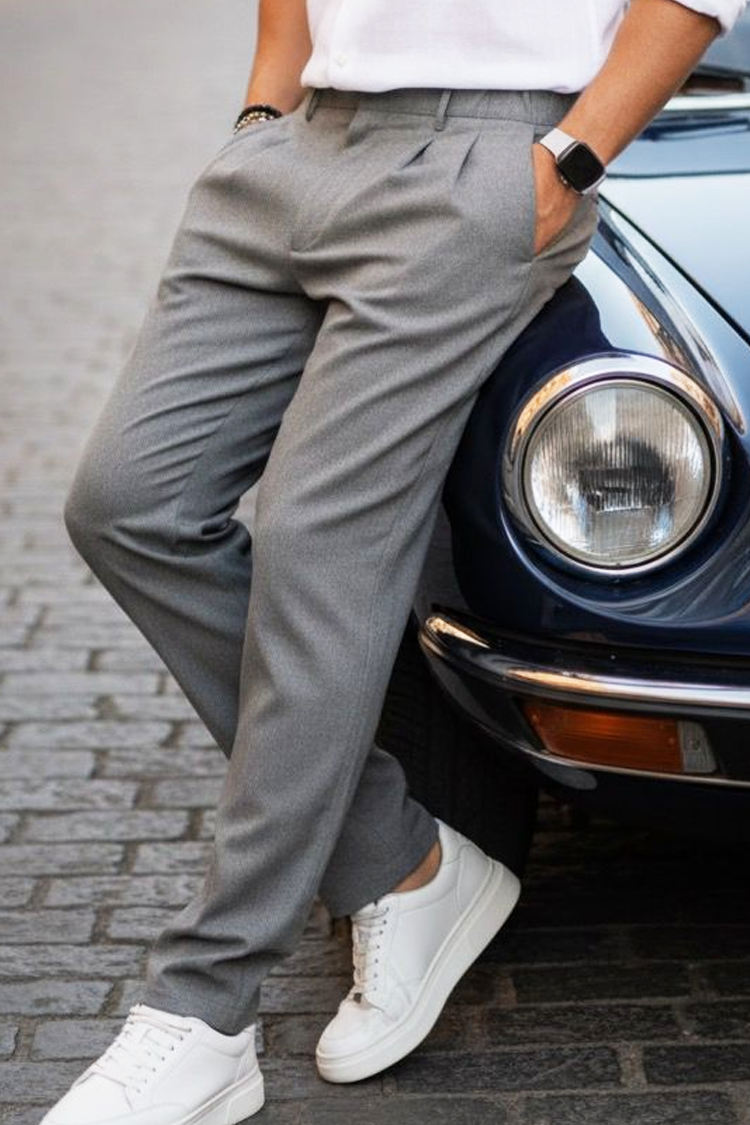 - Stylowe spodnie męskie w kolorze szarym, z kieszeniami i prostymi nogawkami, które przyciągną wzrok.