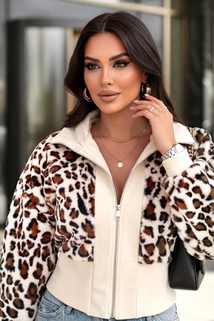 - Model ma atrakcyjny zwierzęcy print i zapięcie na zamek błyskawiczny z przodu.