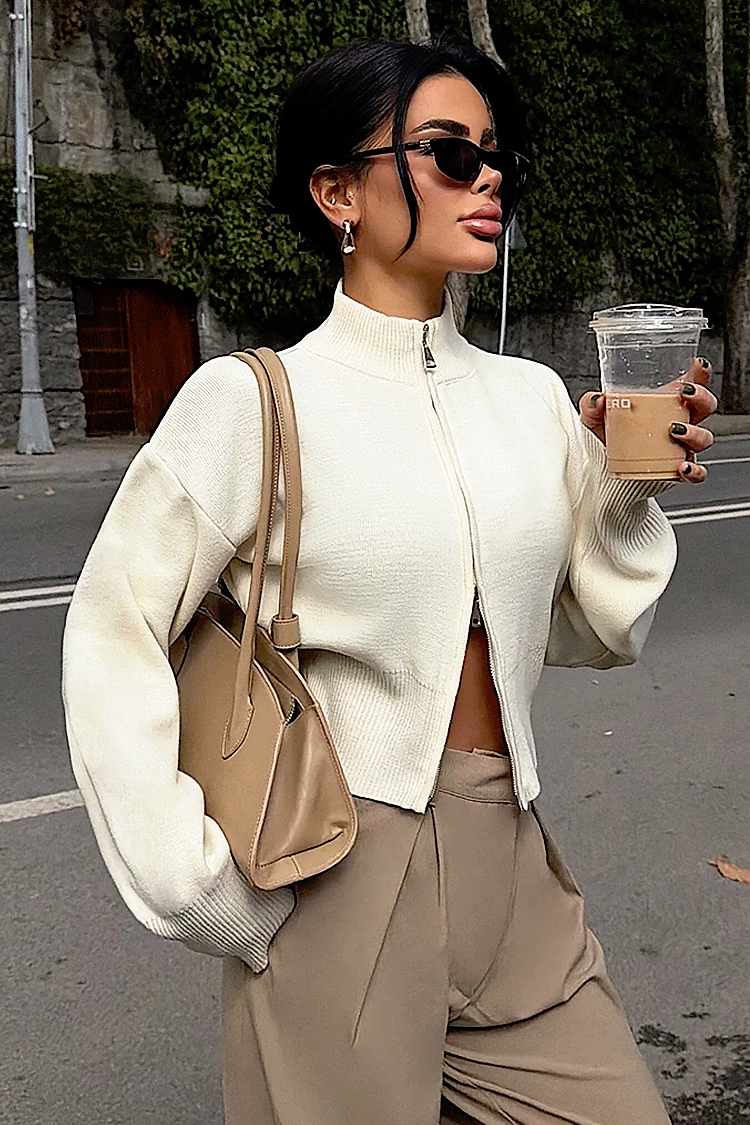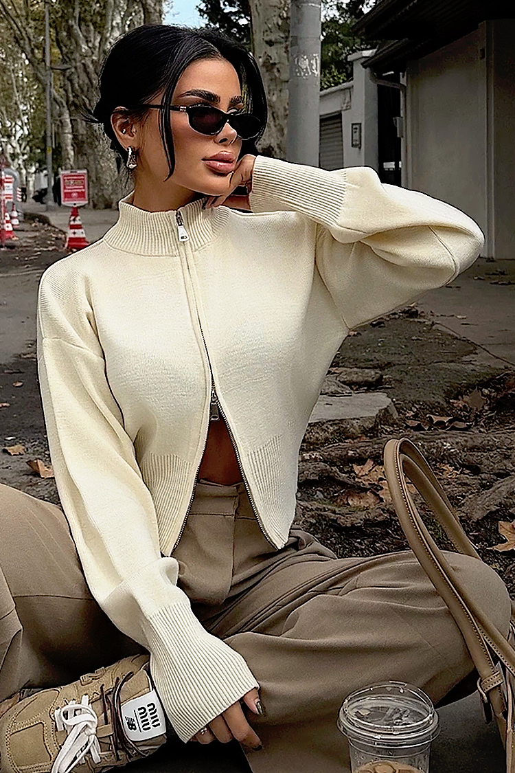 - Model ma kołnierzyk, seksownie dopasowany krój i zapinany jest z przodu na zamek błyskawiczny.