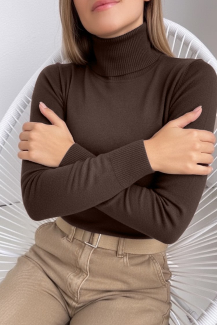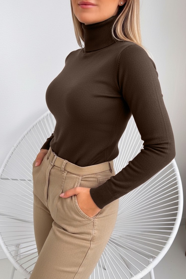 - Model ma długie rękawy, dopasowany krój i elegancki kołnierz typu golf.