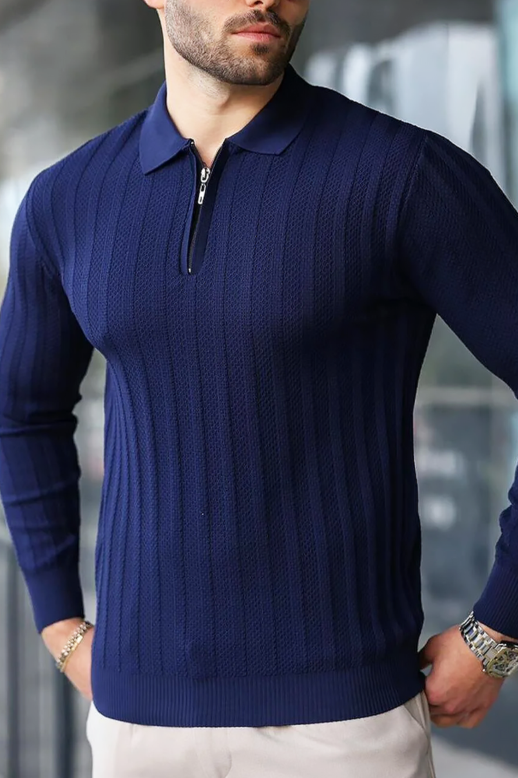 - Wygodny i stylowy męski sweter z kołnierzem zapinanym na suwak i jednolitym wzorem.