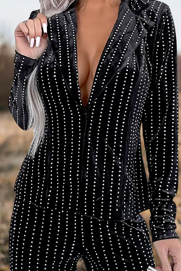 - Kurtka ma kołnierz i klasyczny krój, a spodnie rozszerzane.