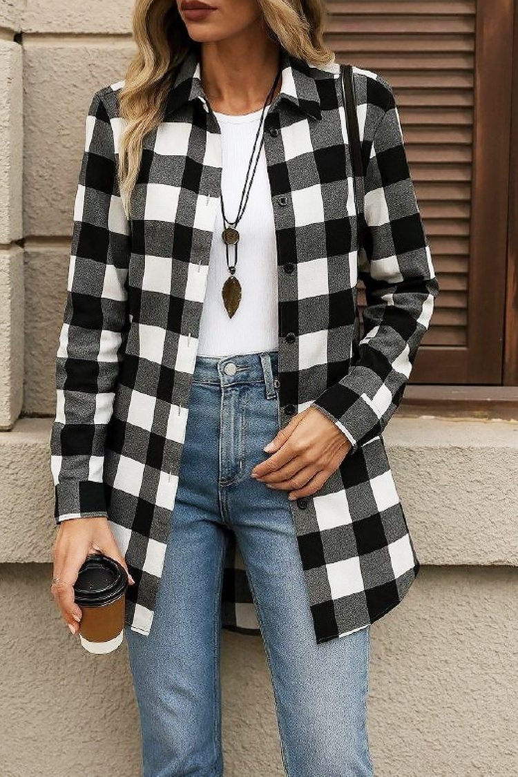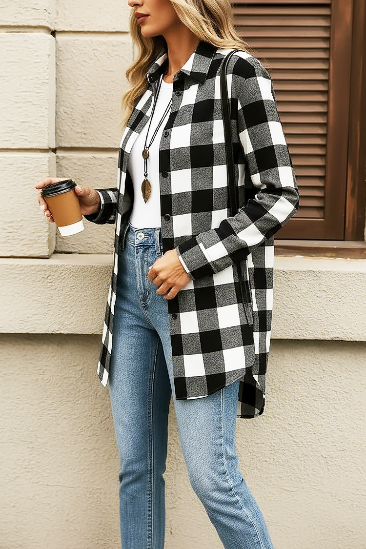 - Model ma asymetryczny krój, kratkę i standardowe zapięcie na guziki.