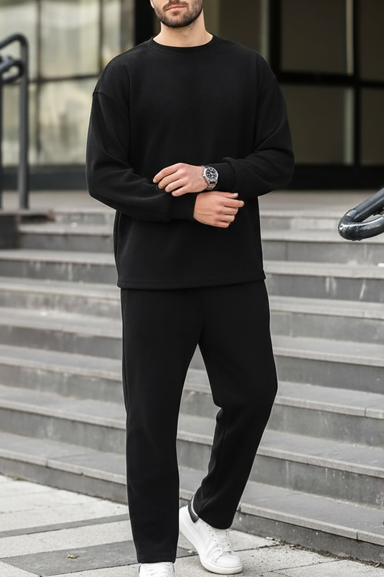 - Wygodny męski dwuczęściowy komplet w kolorze brązowym, składający się z bluzy i spodni.