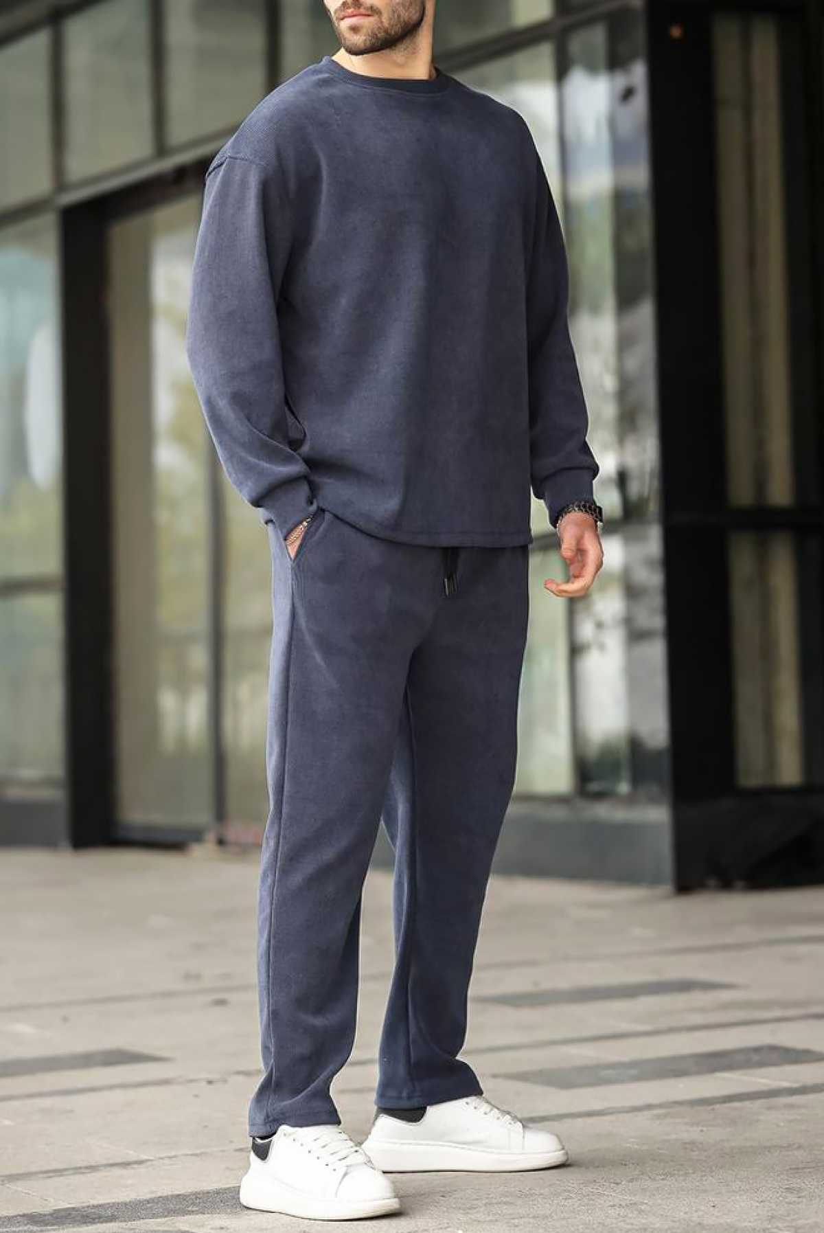 - Wygodny męski dwuczęściowy komplet w kolorze brązowym, składający się z bluzy i spodni.