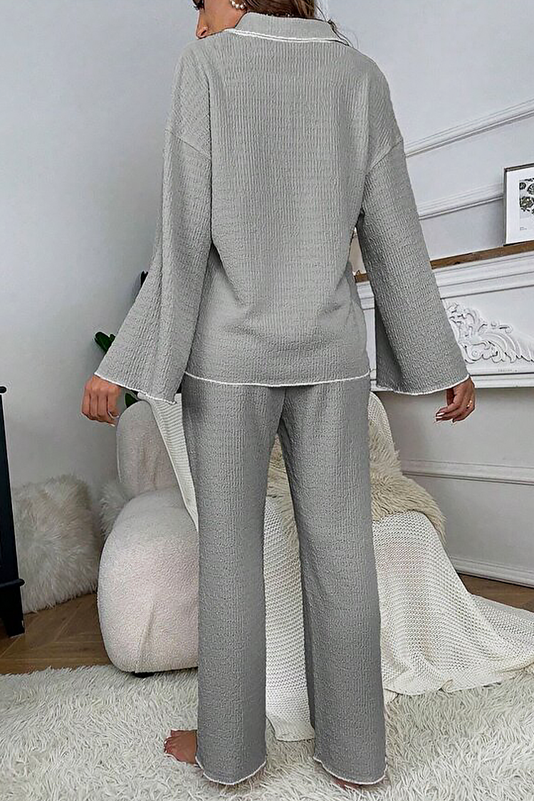 - Góra zapinana jest na guziki i ma kołnierzyk, a spodnie mają wysoki stan i luźny krój.
