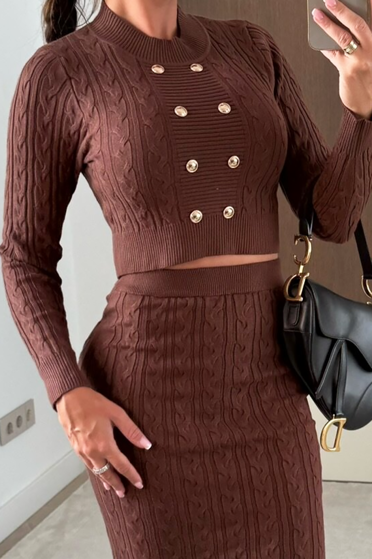 - Aktualny dwuczęściowy komplet – wygodna spódnica i kardigan o klasycznym kroju.