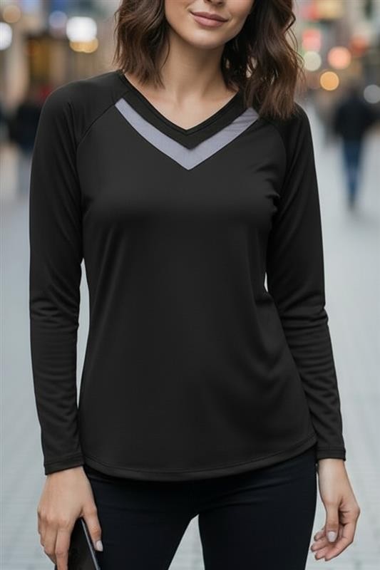 - Model ma wygodny krój, dekolt i długie rękawy.