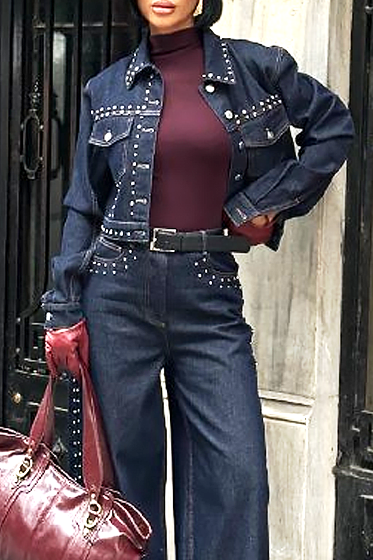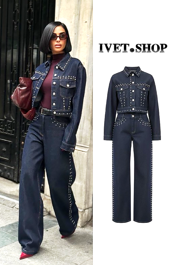 - Damski komplet jeansowy z oczkami, odpowiedni na co dzień.