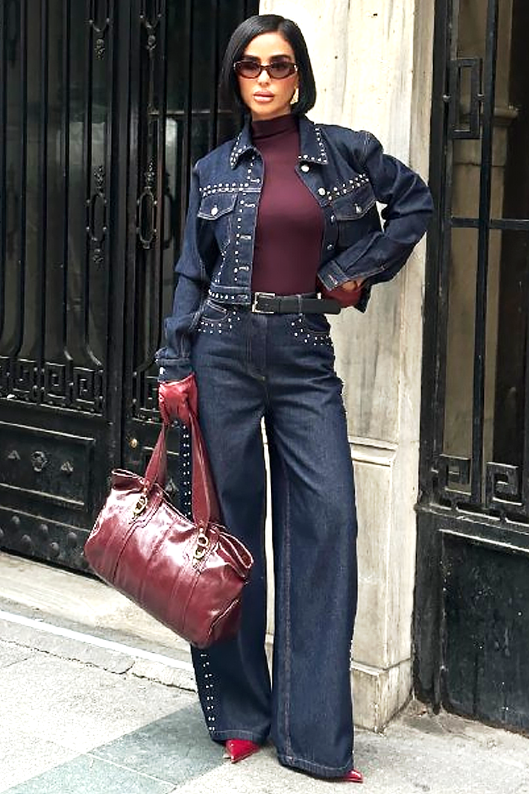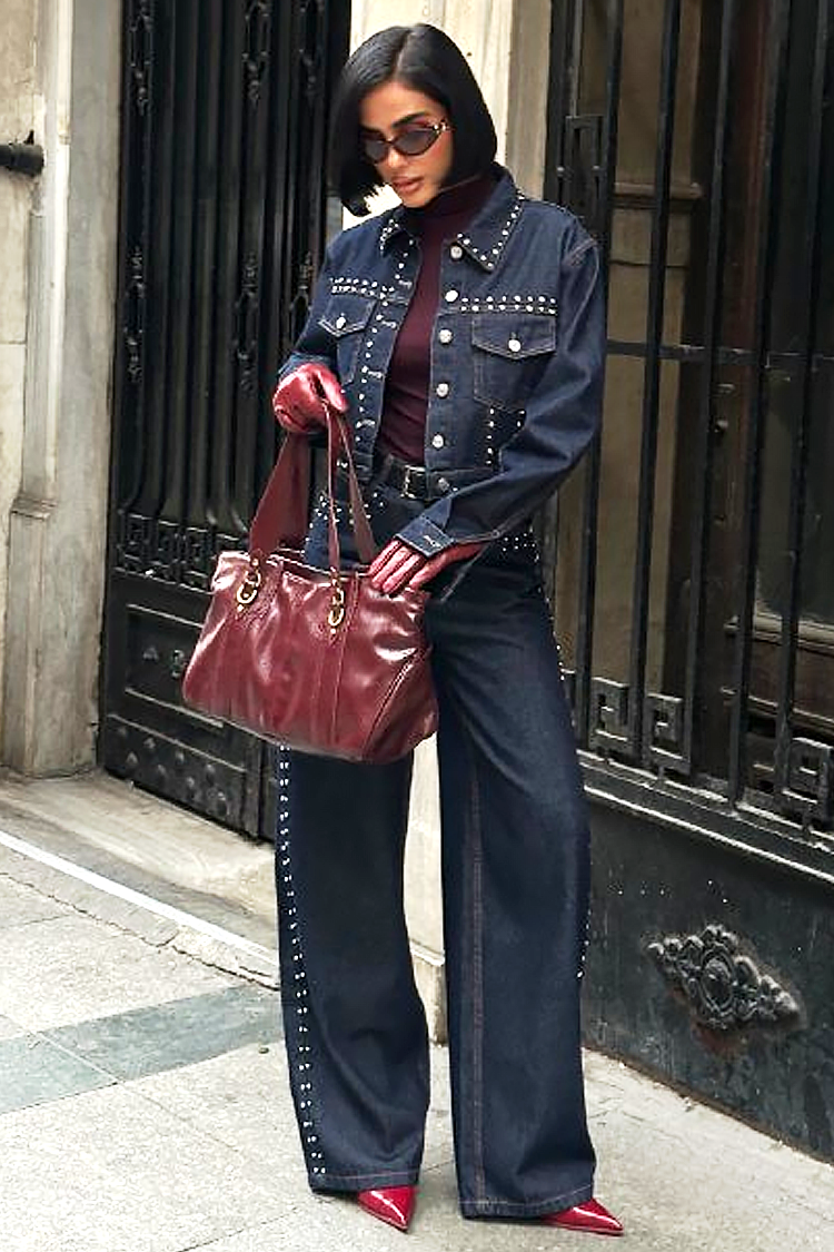 - Kurtka ma standardowe zapięcie na guziki z przodu, a dżinsy mają wysoki stan i wygodne nogawki.