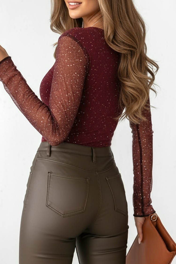 - Bluzka ma długie tiulowe rękawy i błyszczące detale, które dodają jej jeszcze więcej uroku.