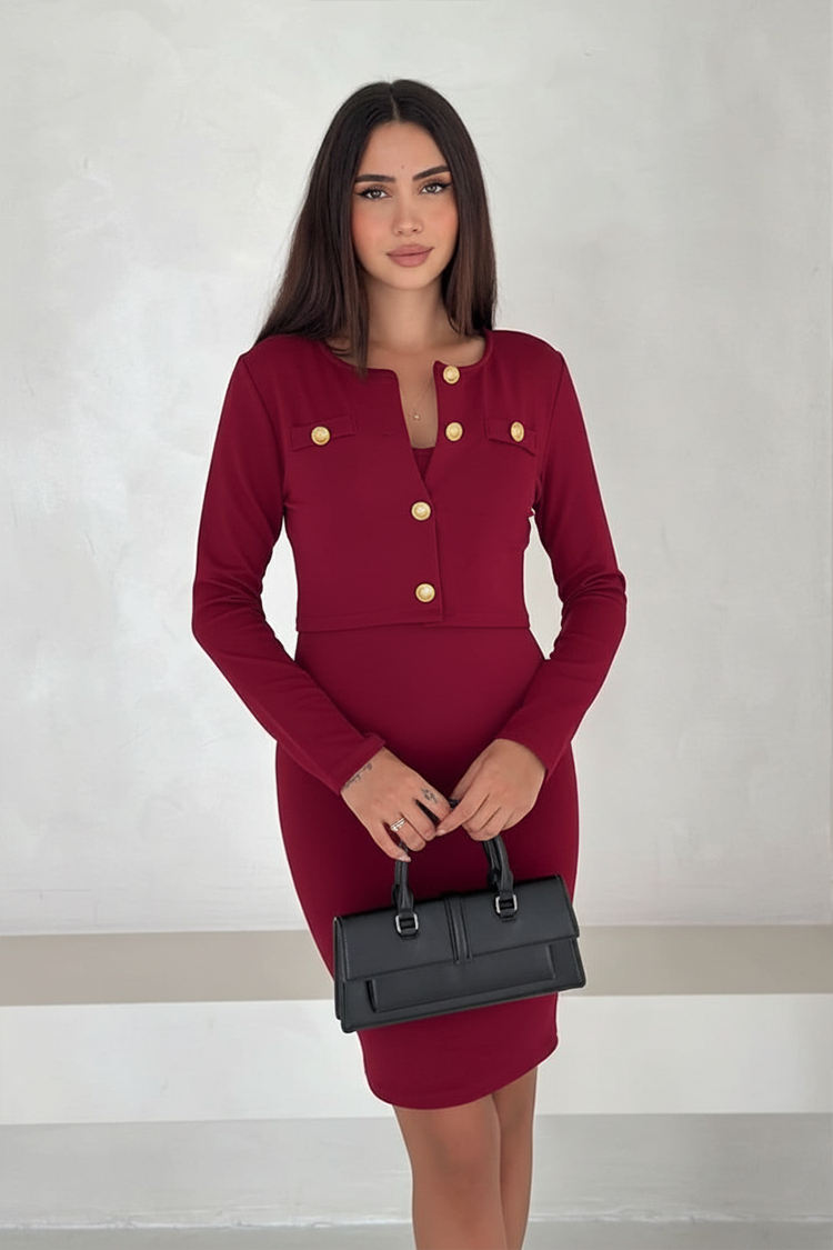 - Sukienka ma dopasowany krój i krótką długość, a żakiet jest zapinany na guziki i ma skróconą długość.