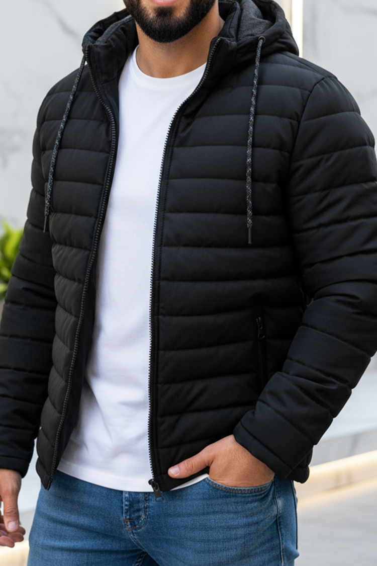- Przedstawiamy Państwu naszą specjalną ofertę: męską kurtkę zimową w modnym fasonie w kolorze czarnym.