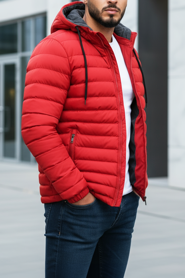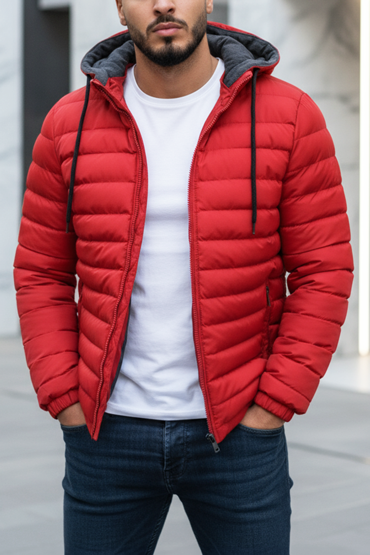 - Przedstawiamy Państwu naszą specjalną ofertę:męską kurtkę zimową w modnym fasonie w kolorze czerwonym.