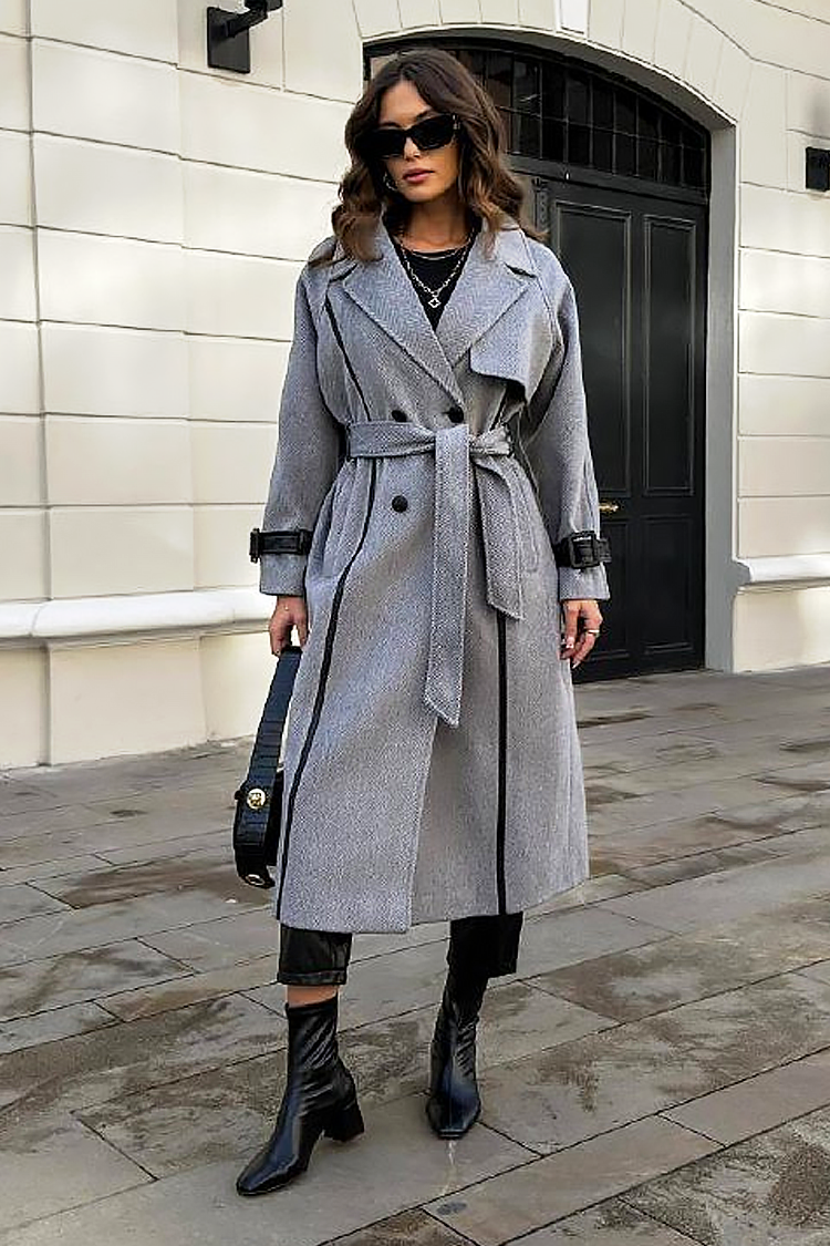 - Wygodny krój, pasujący do każdej sylwetki, do połowy łydki, pasek z tego samego materiału i eleganckie mankiety.