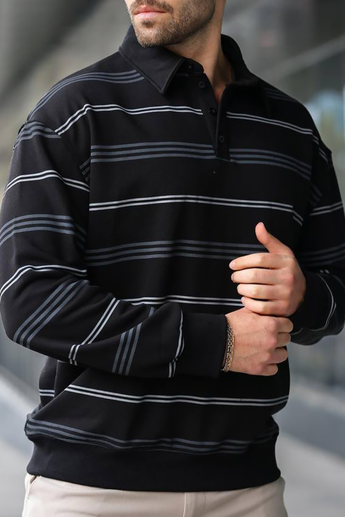 - Męska bluzka na co dzień z kołnierzykiem i zapięciem na guziki przy dekolcie, idealna do różnych stylizacji.
