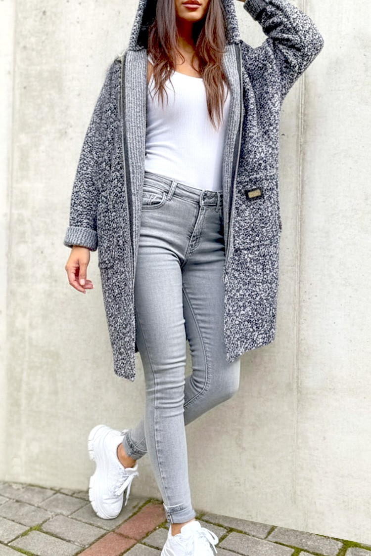 - Model ma efektowny krój i długość, praktyczne kieszenie, kaptur i zapięcie na zamek błyskawiczny.