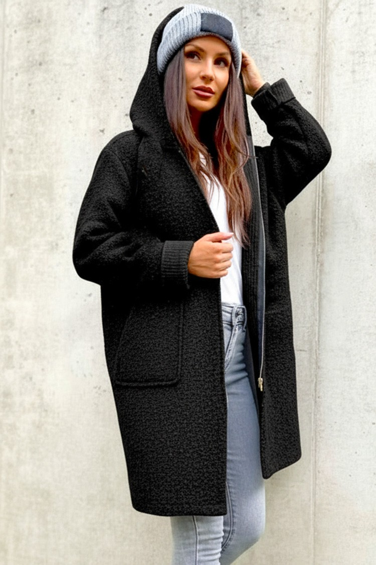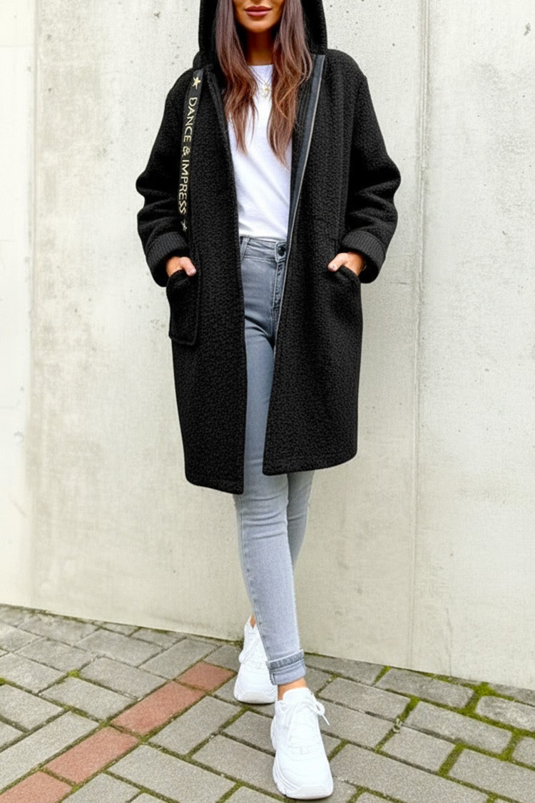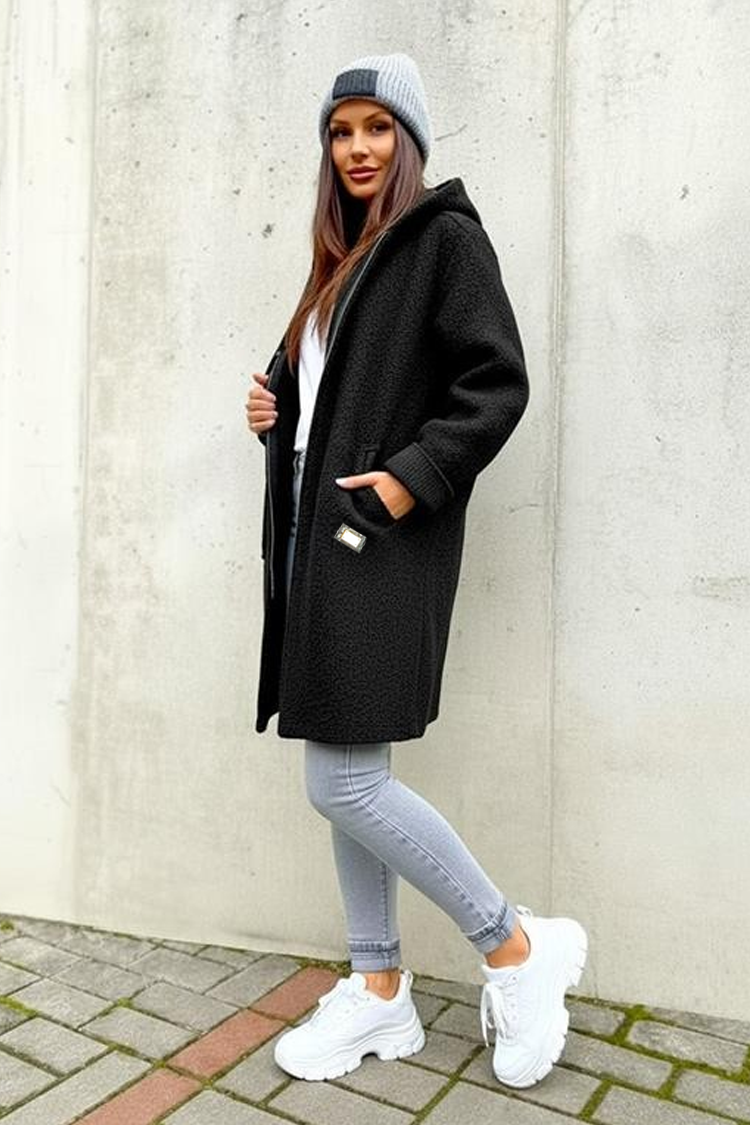 - Model ma efektowny krój i długość, praktyczne kieszenie, kaptur i zapięcie na zamek błyskawiczny.