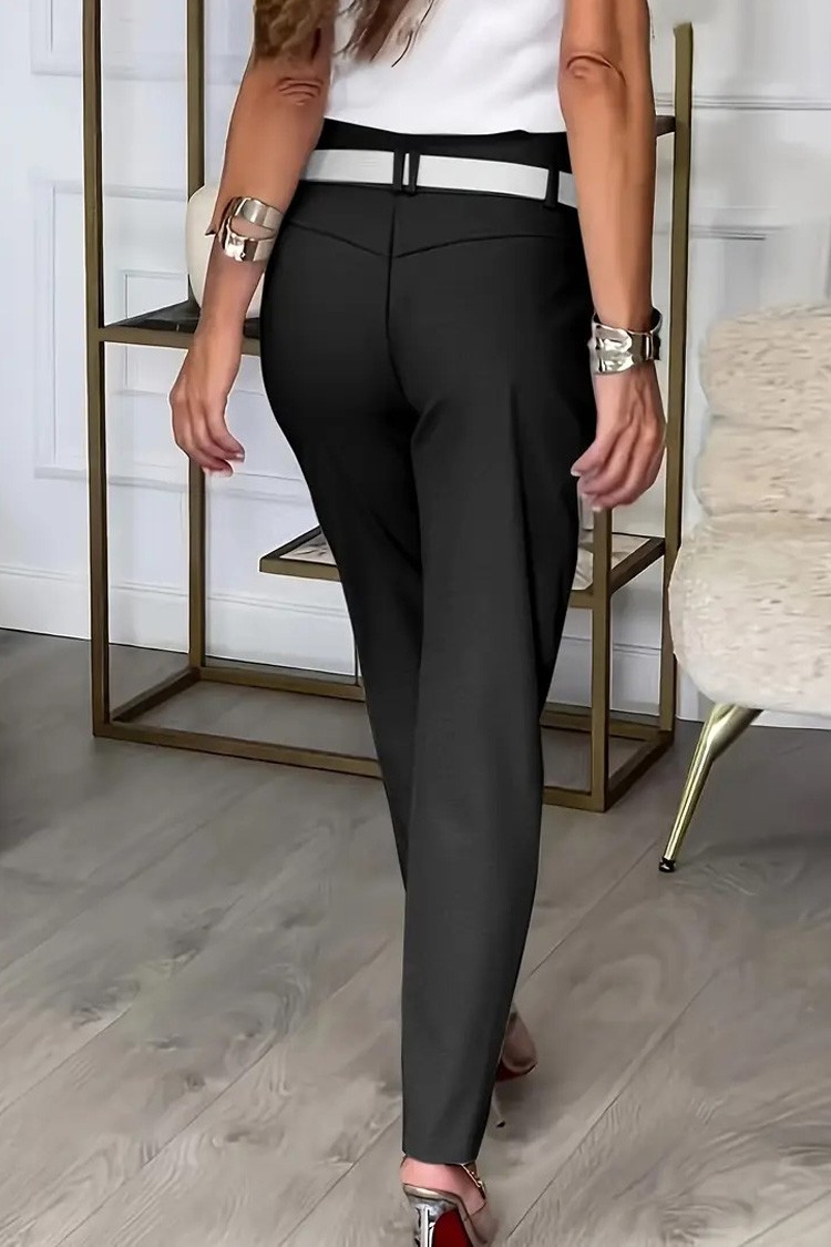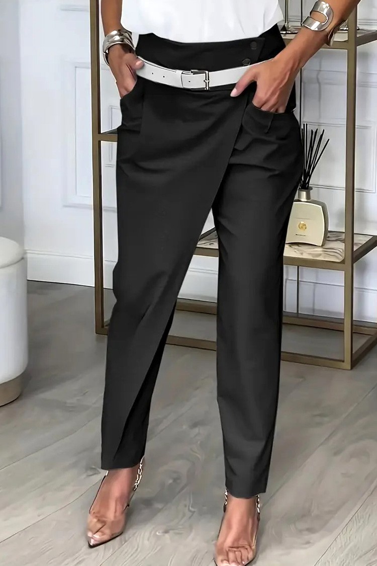 - Damskie spodnie z wysokim, asymetrycznym stanem i guzikami, idealne na co dzień i do biura.