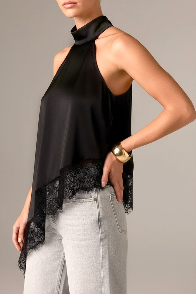 - Model zachwyca asymetrycznym krojem, wysokim kołnierzem i seksowną koronką.