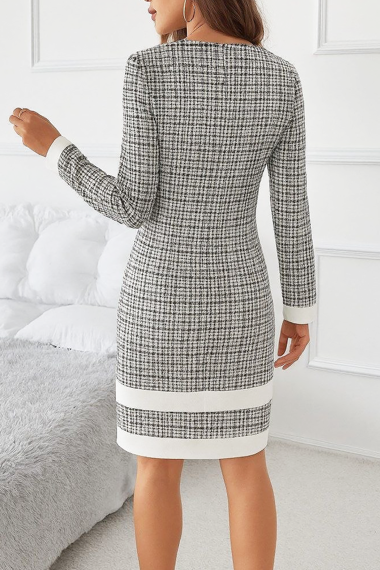 - Model ma krój dopasowany do sylwetki, klasyczny dekolt, efektowny wzór i długie rękawy.