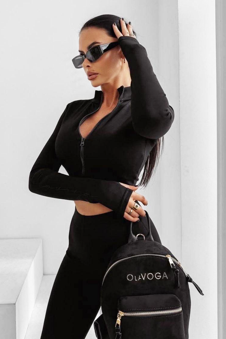 - Góra to bluza o dopasowanym kroju, długości skróconej, zapinana na zamek i kołnierz.