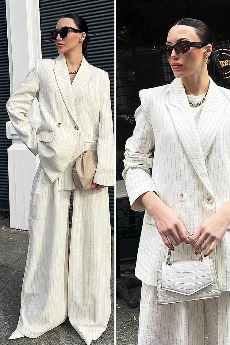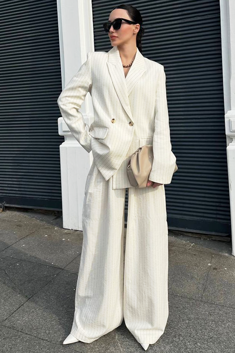 - Spodnie mają prostą nogawkę, a marynarka jest dwurzędowa, zapinana na guziki, z kołnierzem i efektownymi kieszeniami.