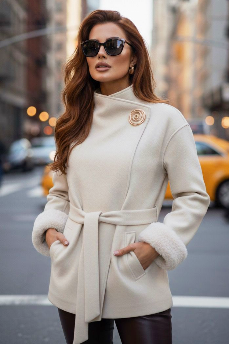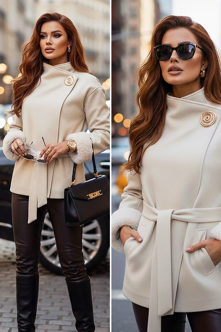 - Model ma wygodny krój, kołnierz, pasek z tego samego materiału oraz efektowne mankiety z pierzem i ozdobną broszką.