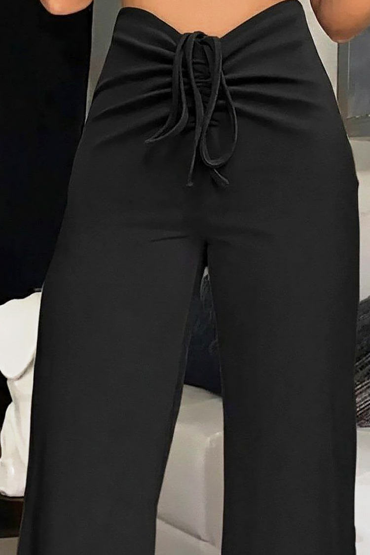 - Model ma wysoki stan z sznurkami i szerokie nogawki.