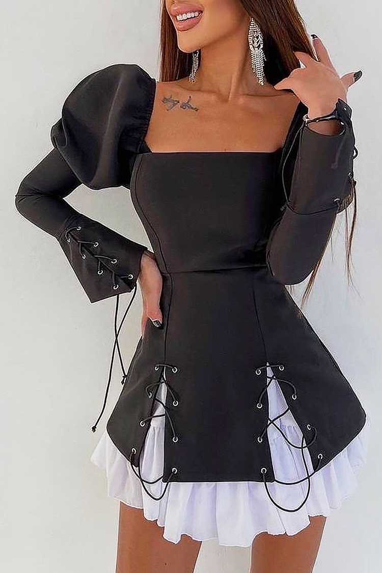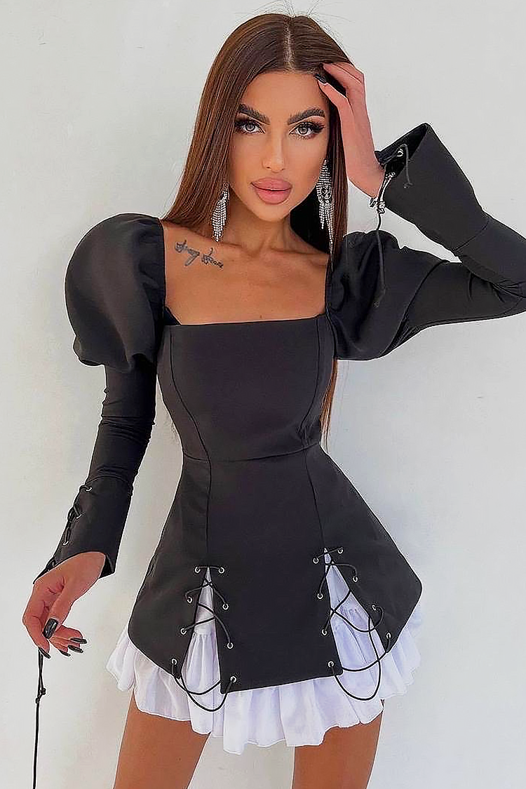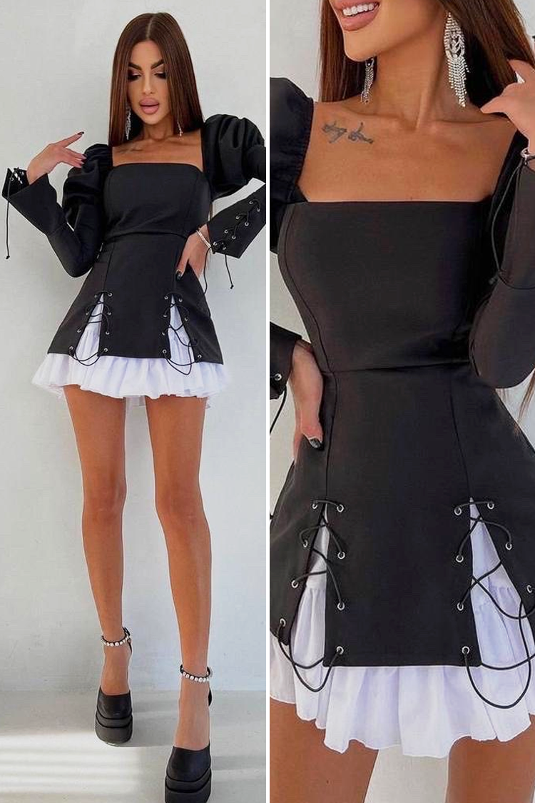 - Sukienka ma seksowny krój, kwadratowy dekolt oraz długie, efektowne rękawy.