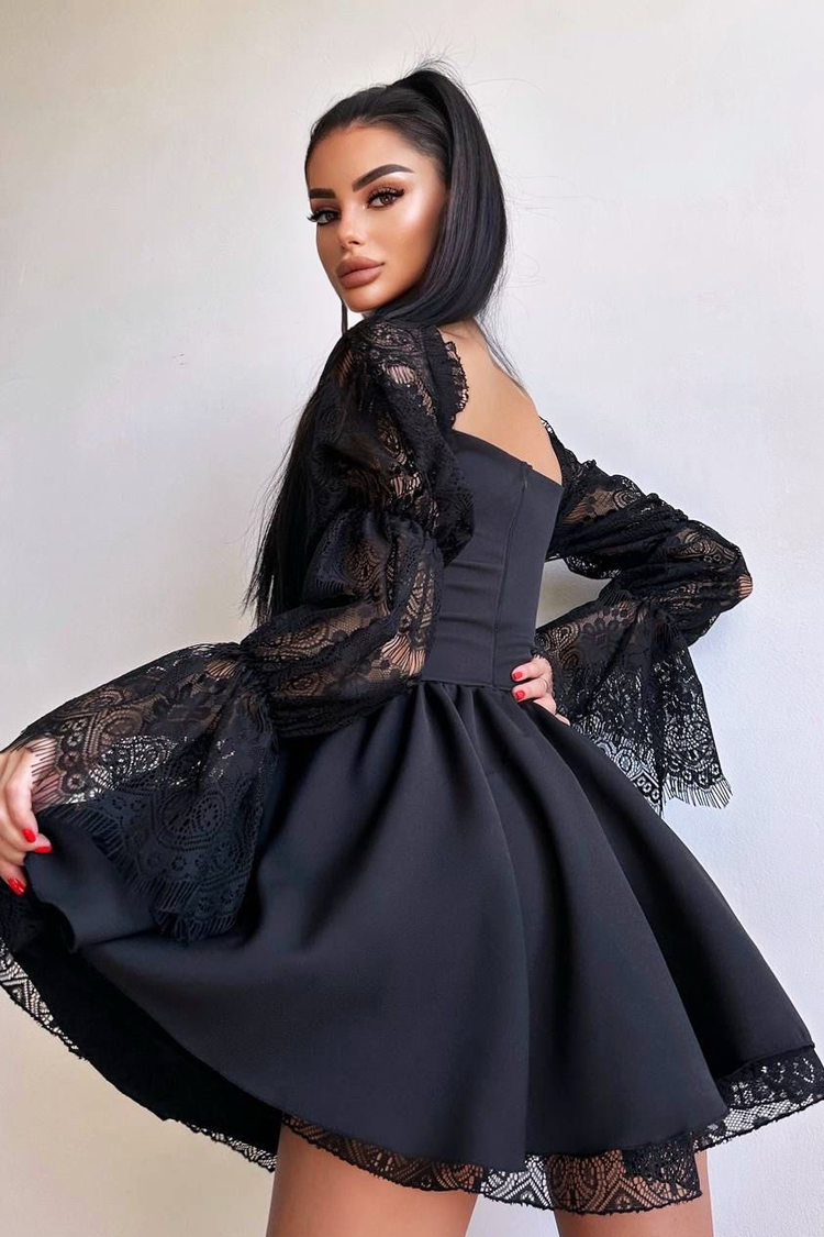 - Sukienka ma dopasowany krój, długie rękawy z koronką, opuszczone ramiona oraz atrakcyjny dekolt.