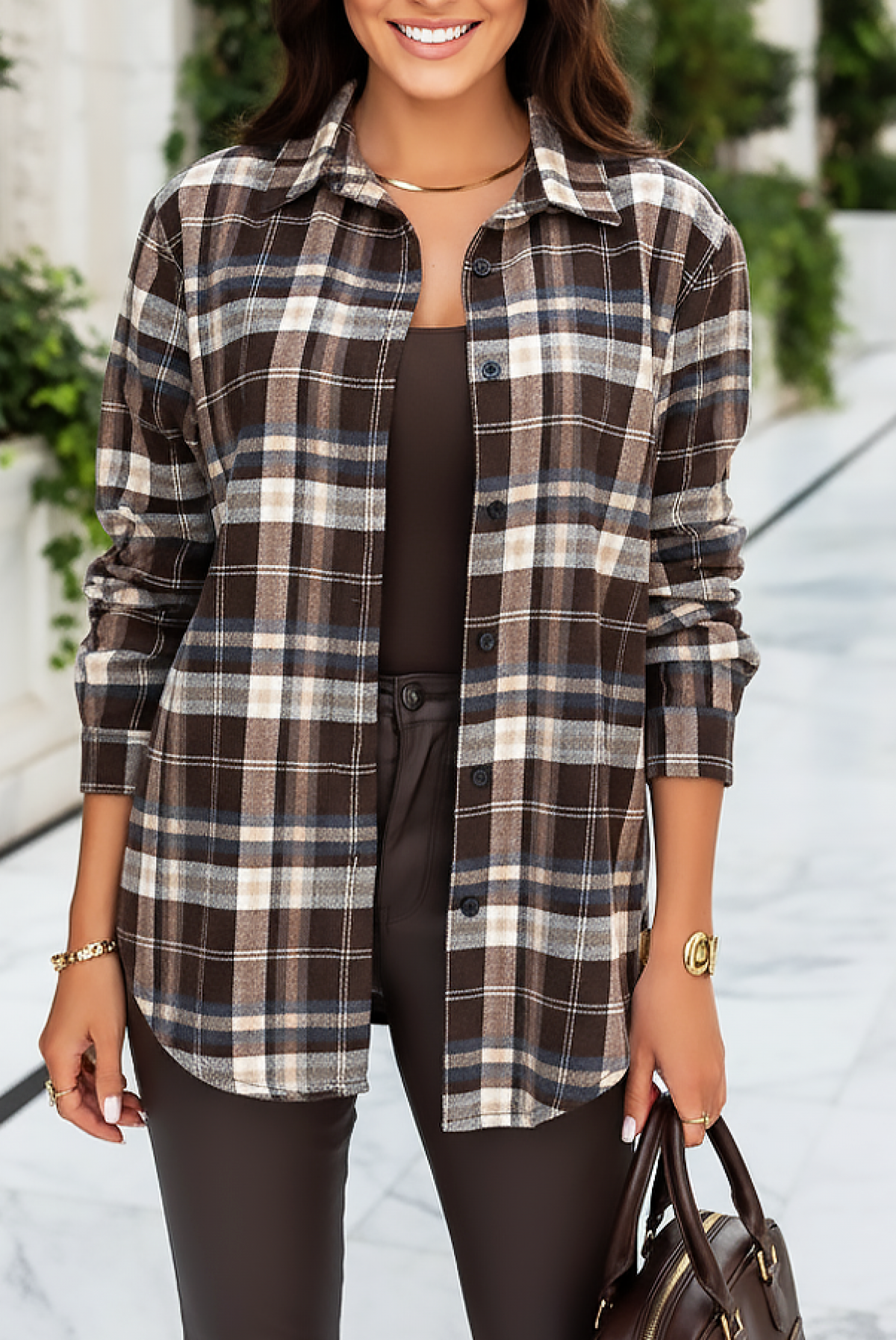 - Model ma wzór w kratę, standardowe zapięcie na guziki oraz oversize’owy krój.