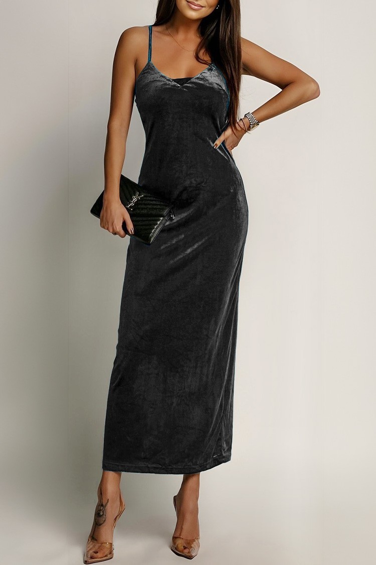 - Sukienka ma dopasowany krój, cienkie ramiączka i długą długość. Model zapinany jest na ukryty zamek z tyłu.