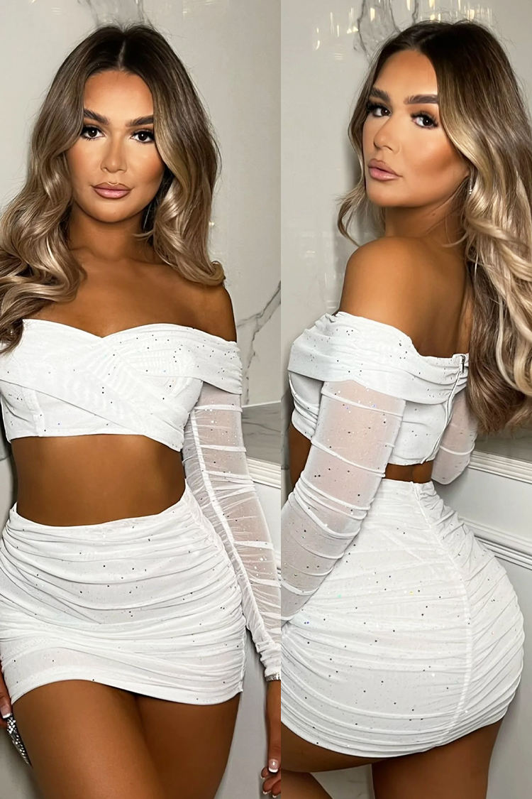 - Bluzka ma długość crop, seksowny krój, efektowne dekolt i długie rękawy, a spódnica dopasowany krój i krótką długość.