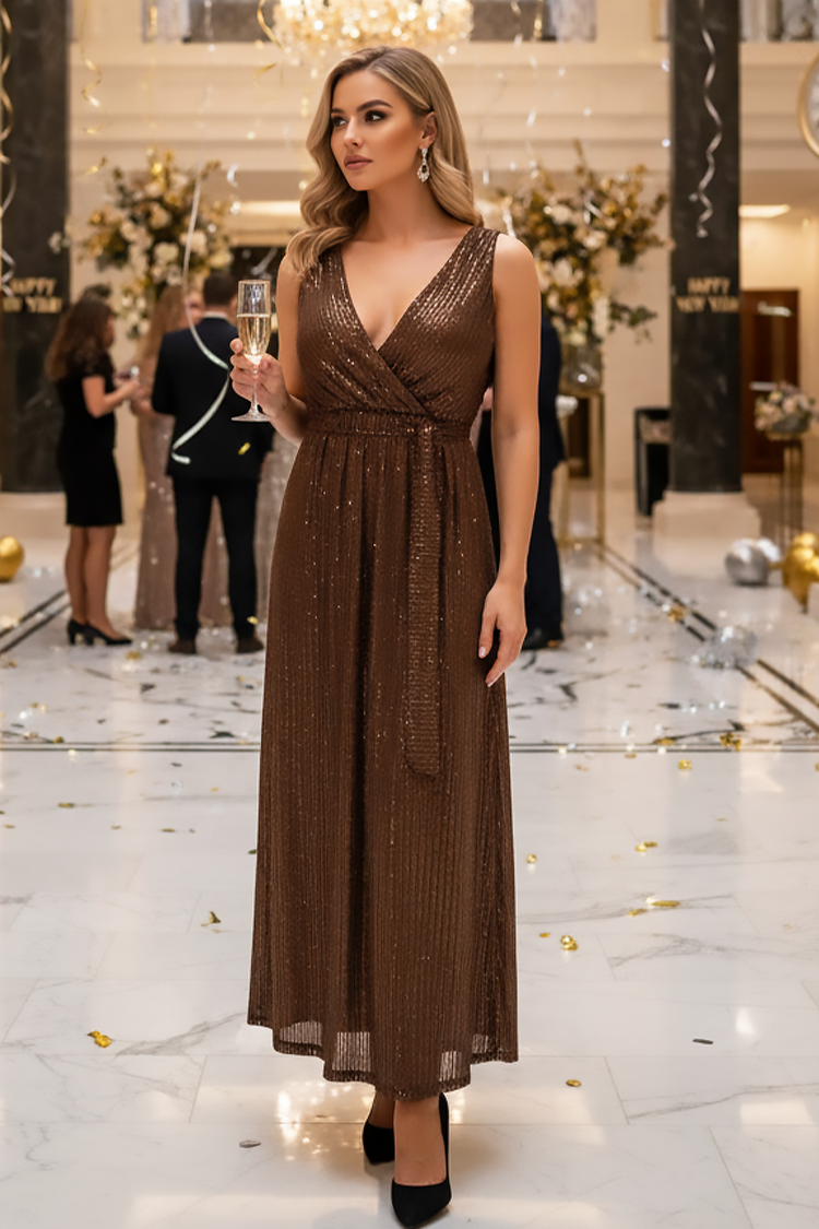 - Dla perfekcyjnej imprezowej stylizacji postaw na tę długą sukienkę o efektownym, błyszczącym designie.