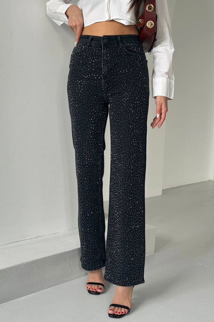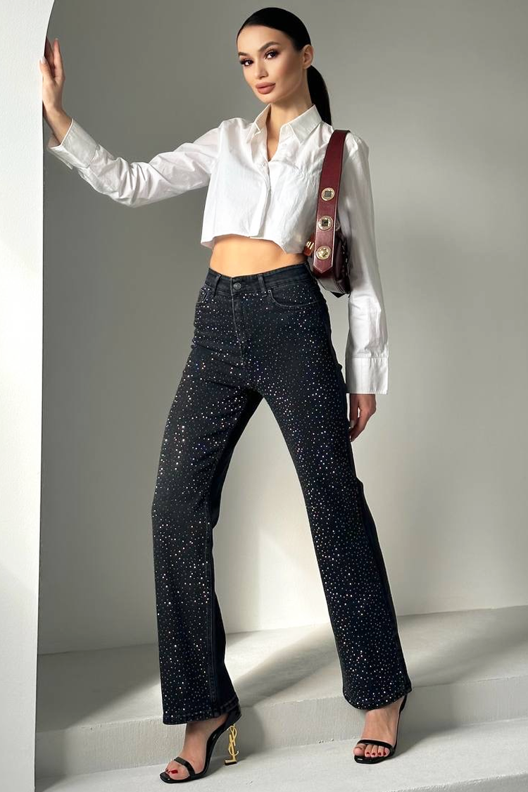 - Model ma wysoki stan, szerokie nogawki, kieszenie i błyszczące detale z przodu.