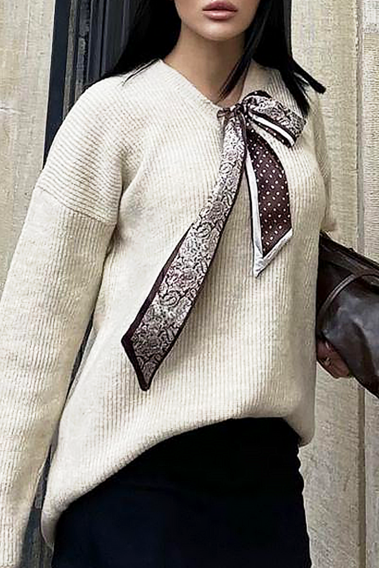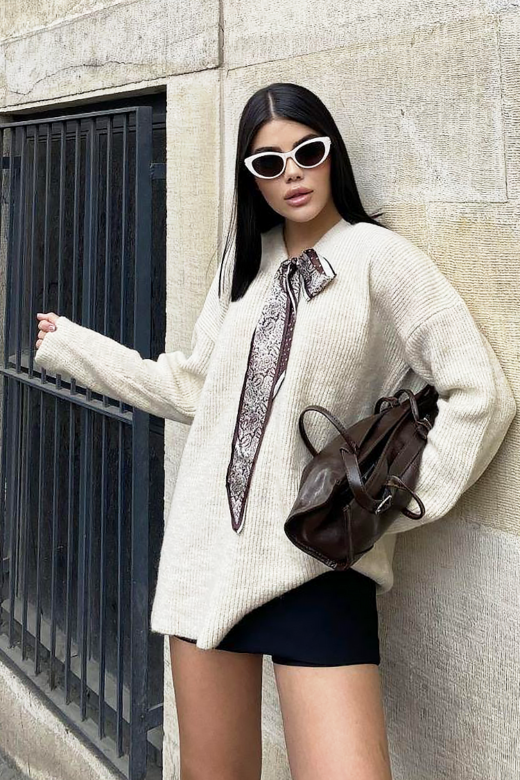 - Swobodny krój, pasujący do każdej sylwetki, z dekoltem w serek i efektownym szalikiem.