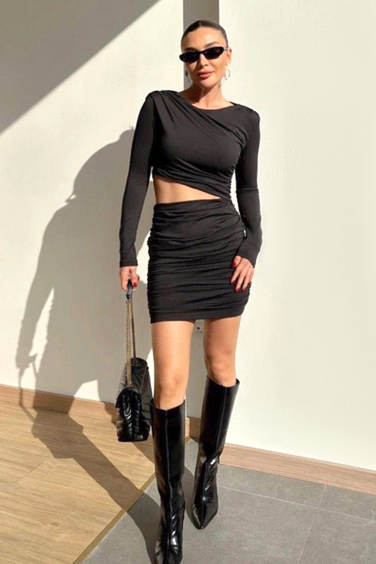 - Model ma długie rękawy, dopasowany krój i seksowne wycięcie w talii.